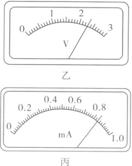 (3) 测量多组数据可得$ R_x $的$ I-U $特性曲线。若在某次测量中,电压表、电流表的示数分别如图乙和图丙所示,则此时$ R_x $两端的电压为$ V $,流过$ R_x $的电流为$ mA $,此组数据得到的$ R_x $的阻值为$ \Omega $(保留三位有效数字)。