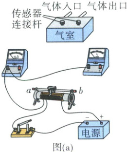 电阻型氧气传感器的阻值会随所处环境中的氧气含量发生变化。在保持流过传感器的电流(即工作电流)恒定的条件下,通过测量不同氧气含量下传感器两端的电压,建立电压与氧气含量之间的对应关系,这一过程称为定标。一同学用图(a)所示电路对他制作的一个氧气传感器定标。实验器材有:装在气室内的氧气传感器(工作电流$ 1\ mA $)、毫安表(内阻可忽略)、电压表、电源、滑动变阻器、开关、导线若干、$ 5 $个气瓶(氧气含量分别为$ 1\% $、$ 5\% $、$ 10\% $、$ 15\% $、$ 20\% $)。