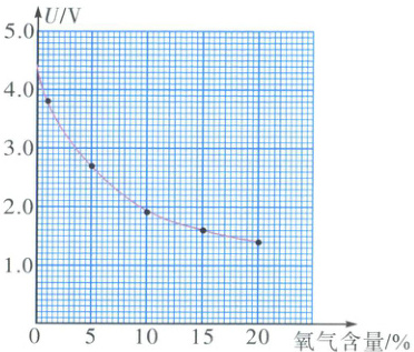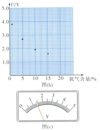 (6) 获得的氧气含量分别为$ 1\% $、$ 5\% $、$ 10\% $和$ 15\% $的数据已标在图(b)中;氧气含量为$ 20\% $时电压表的示数如图(c),该示数为$ V $(结果保留$ 2 $位小数)。