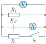 如图所示的电路中,当$S$闭合时,电压表和电流表(均为理想电表)的示数分别为$1.6\ V$和$0.4\ A$。当$S$断开时,它们的示数分别改变$0.1\ V$和$0.1\ A$,求电源的电动势和内阻。