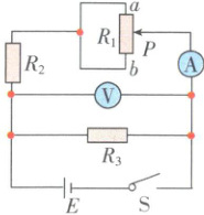 (多选)如图所示电路中,电源电动势一定且内阻忽略不计。闭合开关,电压表示数为$U$,电流表示数为$I$;在滑动变阻器$R_{1}$的滑片$P$由$a$端滑到$b$端的过程中()。
