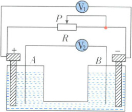 6.(能力点1)(多选)如图所示是研究电源内、外电压的实验装置。“+”“-”是电池的两极,A、B 是位于两极内侧的探针,电压表 $V_1$、$V_2$ 分别接在电池的两极和两探针上,$R$ 是滑动变阻器,$P$ 是它的滑片,下列说法中正确的是(