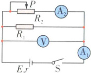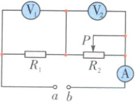 )。A.$P$ 向右滑动时,$V_1$ 的示数增大
