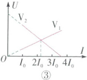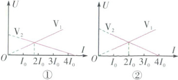 7.C 【解析】分析电路结构可知,电压表$V_{1}$的读数等于定值电阻$R_{1}$两端的电压,可知$V_{1}$的示数随I变化的图像是经过坐标原点的直线,且图线的斜率等于$R_{1}$的阻值,若把$R_{1}$与电源内阻r之和看作等效电源的内阻,可知$V_{2}$的示数随I变化的图像为向下倾斜的直线,其斜率的绝对值等于$R_{1}+r,$根据几何关系可知,$V_{1}$对应图线的斜率小于$V_{2}$对应图线斜率的绝对值,故图③是合理的,C正确,A、B、D错误。