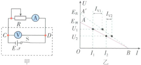 此外也可用电路结构来分析:若把图甲中的$R$和电流表看成外电路,则电压表可看成内电路的一部分,故实际测出的是电源和电压表这个整体的等效内阻$r_{测}$和电动势$E$,电压表和电源并联,故等效内阻$r_{测}$小于电源内阻$r_{真}$,即$r_{测} < r_{真}$;外电路断开时,$C$、$D$两点间电压$U_{CD}$即等效电动势$E$,此时电压表与电源构成回路,故$U_{CD} < E_{真}$,即$E_{测} < E_{真}$。