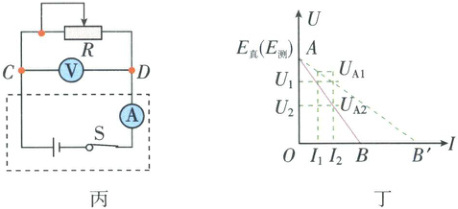 用电路结构来分析。若把图丙中的$R$和电压表看成外电路,则电流表可看成内电路的一部分,故实际测出的是电源和电流表这个等效电源的电动势和内阻$r$,故等效内阻$r$大于电源内阻$r_{真}$,即$r_{测} > r_{真}$;外电路断开时,$C$、$D$两点间的电压$U_{CD}$即等效电动势,因此$U_{CD} = E_{真}$,即$E_{测} = E_{真}$,但由于$R_A$和$r_{真}$相当,致使内阻测量相对误差太大。