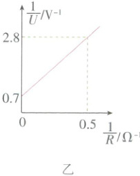 (2)甲同学已经测得电阻 $R_1 = 4.8\ \Omega$,继续测电源电动势 $E$ 和电阻 $R_2$ 的阻值,该同学的做法是闭合 $ S_1$,将 $ S_2$ 切换到 $a$,多次调节电阻箱,读出多组电阻箱示数 $R$ 和对应的电压表示数 $U$,由测得的数据绘出了如图乙所示 $\frac{1}{U} - \frac{1}{R}$ 图像,则电源电动势 $E =$$ V$,电阻 $R_2 =$$\Omega$。(结果保留两位有效数字)