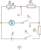 (1)先测电阻 $R_1$ 的阻值,请将甲同学的操作补充完整:闭合 $ S_1$,将 $ S_2$ 切换到 $a$,调节电阻箱,读出其示数 $R'$ 和对应的电压表示数 $U_1$;保持电阻箱示数不变,,读出电压表的示数 $U_2$。则电阻 $R_1$ 的表达式为 $R_1 =$。