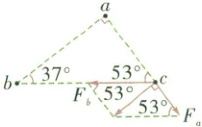 解 由题意知$ \angle b = 37° $,$ \angle a = 90° $,由小球$ c $所受库仑力合力的方向知$ a $、$ b $带异种电荷,小球$ a $、$ b $对小球$ c $的作用力如图所示。由库仑定律得$ F_a = k\frac{q_a q_c}{r_{ac}^2} $,$ F_b = k\frac{|q_b q_c|}{r_{bc}^2} $。由几何关系得$ \sin 37° = \frac{F_a}{F_b} $,又$ n = \left| \frac{q_a}{q_b} \right| $,联立各式解得$ n = \frac{27}{125} $,选项D正确。