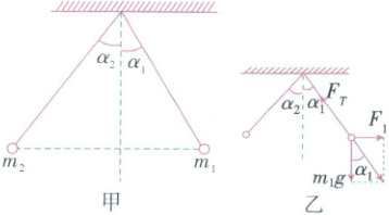 解 质量为$ m_1 $的小球受$ F_T $、$ F_1 $、$ m_1g $三个力的作用,处于平衡状态,如图乙所示,根据平衡条件和力的合成可知
