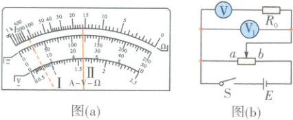 学生实验小组要测量量程为 3 V 的电压表 V 的内阻$R_ \mathrm{V}$。可选用的器材有:多用电表,电源 E (电动势 5 V),电压表$V_ \mathrm{1}$(量程 5 V,内阻约 3 kΩ),定值电阻$R_ \mathrm{0}$(阻值为 800 Ω),滑动变阻器$R_ \mathrm{1}$(最大阻值 50 Ω),滑动变阻器$R_ \mathrm{2}$(最大阻值 5 kΩ),开关 S,导线若干。