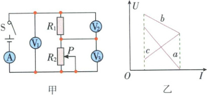 (多选)在如图甲所示的电路中,电源的电动势为$E$,内阻为$r$,$R_1$为定值电阻,$R_2$为滑动变阻器,闭合开关$S$,在滑动变阻器的滑片$P$向上滑动的过程中,四个理想电表的示数都发生了变化。图乙中的三条图线分别表示了三个电压表示数的变化情况。则下列说法正确的是()。