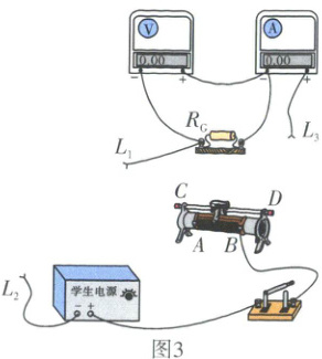 ①采用图3中的器材进行实验,部分实物连接已完成。要求闭合开关后电压表和电流表的读数从0开始。导线$L_1$、$L_2$和$L_3$的另一端应分别连接滑动变阻器的、、接线柱(以上三空选填接线柱标号“$A$”“$B$”“$C$”或“$D$”)。