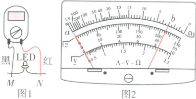 使用多用电表的“$× 10\ k$”欧姆挡测量二极管的电阻。如图1所示,当黑表笔与接线端$M$接触、红表笔与接线端$N$接触时,多用电表指针位于表盘中$a$位置(见图2);对调红、黑表笔后指针位于表盘中$b$位置(见图2),由此判断$M$端为二极管的(填“正极”或“负极”)。