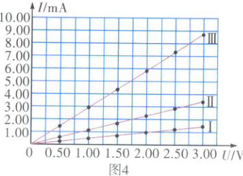 ②图4为不同光照强度下得到的光敏电阻伏安特性曲线,图中曲线Ⅰ、Ⅱ和Ⅲ对应光敏电阻受到的光照由弱到强。由图像可知,光敏电阻的阻值随其表面受到光照的增强而(填“增大”或“减小”)。