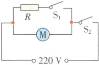5.( 能力点 )如图所示是理发店用的某款电吹风的电路图,它主要由电动机$M$和电热丝$R$构成。当闭合开关$S_{1}、S_{2}$后,电动机驱动风叶旋转,将空气从进风口吸入,经电热丝加热,形成热风后从出风口吹出。已知电吹风的额定电压为$220 V$,吹冷风时的功率为$120 W$,吹热风时的功率为$1 000 W$,关于该电吹风,下列说法正确的是(