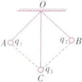 4.(2025·烟台模拟·知识点 1、2·能力点 1)如图所示,三个质量均为$m$的带正电小球$A$、$B$、$C$被三根不可伸长的绝缘细绳系于$O$点,三球平衡时绳$OC$处于竖直方向,且悬点$O$、球$A$、球$C$和球$B$所在位置恰好组成一个边长为$a$的正方形。已知$A$、$B$、$C$的电荷量分别为$q_{1}$、$q_{2}$、$q_{3}$,$mg=\frac{kq_{1}^{2}}{a^{2}}$,$k$为静电力常量,重力加速度为$g$,则$q_{1}:q_{2}:q_{3}$等于(