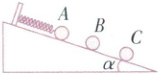 6.(知识点 1、2·能力点 1、2)如图所示,在倾角为$\alpha$的光滑绝缘斜面上固定一个挡板,在挡板上连接一根劲度系数为$k_{0}$的绝缘轻质弹簧,弹簧另一端与$A$球连接。$A$、$B$、$C$三小球的质量均为$M$,$q_{A}=q_{0}>0$,$q_{B}=-q_{0}$,当系统处于静止状态时,三小球等间距排列。已知静电力常量为$k$,重力加速度为$g$,则(