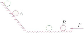 8.(能力点 1、3)(多选)如图所示,两个带电小球$A$、$B$分别处在光滑绝缘的斜面和水平面上,且在同一竖直平面内,用水平向左的推力$F$作用于$B$球,两球在图示位置静止。现将$B$球水平向左移动一小段距离,发现$A$球随之沿斜面向上移动少许,两球在虚线位置重新平衡。与移动前相比,下列说法正确的是(