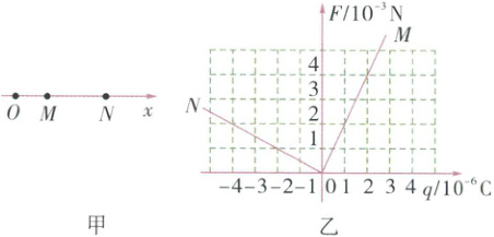 4.(知识点1)(多选)如图甲所示,在 $x$ 轴上有一个点电荷 $Q$(图中未画出),$O$、$M$、$N$ 为轴上三点。放在 $M$、$N$ 两点的试探电荷受到的电场力跟试探电荷所带电荷量的关系如图乙所示,则(