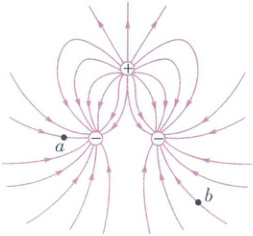 解 由题图可以看出$ a $处电场线更密,所以$ E_a > E_b $;根据对称性,$ a $处的电势应与右侧负电荷附近的对称点的电势相等,再根据沿电场线方向电势降低可以判定$ \varphi_b > \varphi_a $,故正确选项为C。