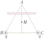 如图所示,真空中有两个电荷量均为 $q$($q > 0$)的点电荷,分别固定在正三角形 $ABC$ 的顶点 $B$、$C$,$M$ 为三角形 $ABC$ 的中点,沿 $AM$ 的中垂线对称放置一根与三角形共面的均匀带电细杆,电荷量为 $\frac{q}{2}$。已知正三角形 $ABC$ 的边长为 $a$,$M$ 点的电场强度为0,静电力常量为 $k$,顶点 $A$ 处的电场强度大小为()。