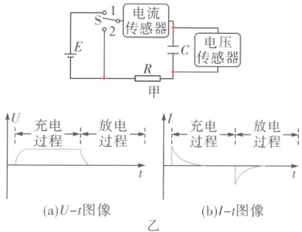 ④ 换上电容器$ C_2 $,重复前面的操作,得到图线Ⅱ(图乙Ⅱ)。