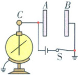 如图所示,电路中$ A $、$ B $是两块竖直放置的金属板,$ C $为静电计。合上开关$ S $后,静电计指针张开一定角度,下列做法可以使静电计指针张角增大的是()。