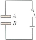 解 电容器在充、放电过程中,电路中将有电流流过,电流方向为正电荷定向移动的方向。在接通$ S $的瞬间,电容器被充电,上极板带正电,下极板带负电,故电流方向由$ A $到$ B $;稳定后,将两极板间距离增大,根据$ C \propto \frac{\varepsilon_r S}{d} $(后面会学)得,电容减小,因为$ U $不变,所以电容器极板上的电荷量$ Q = C U $减小,即电流方向由$ B $到$ A $;将开关$ S $断开后,因为电容器所带电荷量不变,所以无论怎样调节极板间距离,均无电流通过。