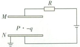 例 如图所示,在水平放置的两平行金属板$ M $、$ N $之间的$ P $点,固定有一个带电荷量为$ -q $的点电荷,两金属板通过电阻$ R $接到直流电源上,其中$ N $板接地。则()。