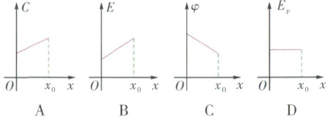 6.(知识点1、2、3·能力点)一平行板电容器充电后与电源断开,负极板接地,两极板间有一个正试探电荷固定在$P$ 点,如图所示。用$C$ 表示电容器的电容、$E$ 表示两极板间的场强、$\varphi$ 表示$P$ 点的电势,$E_p$ 表示正电荷在$P$点的电势能,若正极板保持不动,将负极板缓慢向右平移一小段距离$x_0$的过程中,下列各物理量与负极板移动距离$x$的关系图像中正确的是(