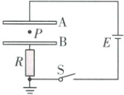 5. BD 【解析】由题图可知,A、B板间的电场强度方向竖直向下,在P点处带电液滴受到重力和电场力处于静止状态,可知带电液滴受到的电场力方向竖直向上,则带电液滴带负电,A错误;由平行板电容器电容的决定式$C=\frac{\varepsilon_{r}S}{4\pi kd'},$可知将A、B板分别沿水平方向向左、向右平移一小段距离,则两板间的正对面积减小,则电容减小,B正确;开关S断开后,电容器所带的电荷量Q不变,因此电阻R中没有电流通过,C错误;由$E=\frac{U}{d}、$$C=\frac{Q}{U}$和$C=\frac{\varepsilon_{r}S}{4\pi kd}$可得$E=\frac{4\pi kQ}{\varepsilon_{r}S},$Q不变,S减小,则两极板之间的电场强度E变大,D正确。故选B、D。