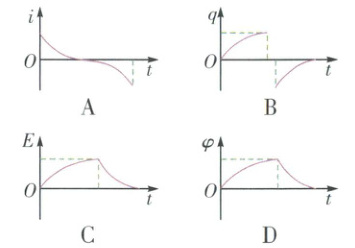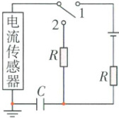 7.(2025·广州检测·知识点1、3)使用如图所示的电路观察电容器$C$的充、放电过程,若开关先接1再接2,则通过电流传感器的电流$i$、电容器左极板所带电荷量$q$、电容器两极板间场强$E$、电容器两极板间某点处电势$\varphi$分别随时间$t$变化的关系中可能正确的是(