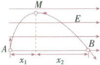 解 (1)小球在竖直方向上做竖直上抛运动,根据对称性可知,从 $A$ 点至 $M$ 点和从 $M$ 点至 $B$ 点的时间 $t$ 相等,小球在水平方向上做初速度为零的匀加速直线运动,设加速度大小为 $a$,则 $x_1 = \dfrac{1}{2}at^2$,$x_2 = \dfrac{1}{2}a(2t)^2 - \dfrac{1}{2}at^2 = \dfrac{3}{2}at^2$,所以 $\dfrac{x_1}{x_2} = \dfrac{1}{3}$。
