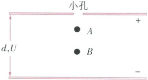 (2)加上电压$U$后,$A$继续以原速度下落,说明$A$不带电;$B$向上匀速运动,由平衡条件得$q\frac{U}{d}-mg = km^{\frac{1}{3}}v_{2}$,其中$v_{2}=\frac{h_{2}}{t}$,又$mg = km^{\frac{1}{3}}\frac{h_{1}}{t}$,联立解得$q = \frac{mgd(h_{1} + h_{2})}{h_{1}U}$,$B$带负电。
