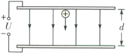 1.(2025·开平一中检测·知识点1)(多选)如图所示,平行板电容器极板间距为$d$,所加电压为$U$,极板间形成匀强电场。一个带正电的粒子从上极板由静止释放,经过时间$t$后到达下极板,在此过程中电场力做功为$W$。忽略重力影响,下列说法正确的有(