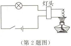 2. 如图所示,将一个废旧日光灯的灯丝接入电路中,用酒精灯加热灯丝,观察到灯泡的亮度渐渐变暗,说明影响导体电阻大小的因素是