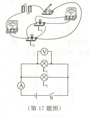 17.用如图所示的元器件连接电路,要求:$L_1$、$L_2$并联,电流表测量干路中的电流(约为 0.4 A),电压表测量灯泡$L_1$两端的电压,开关控制整个电路。请用笔画线表示导线,将图中各个元器件连接起来,并在虚线框内画出对应的电路图。