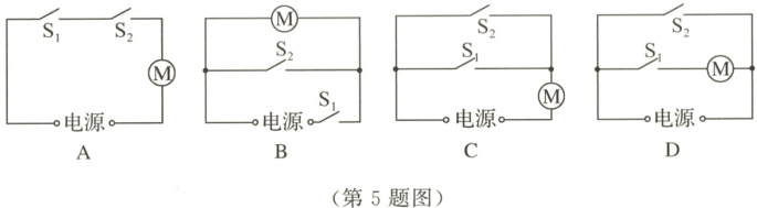 5.为保障校园安全,学校装备了门禁系统。内部车辆可以被自动开关$S_1$识别,电动机M工作,外部车辆需要保安闭合手动开关$S_2$,使电动机M工作。下列模拟电路符合要求的是()