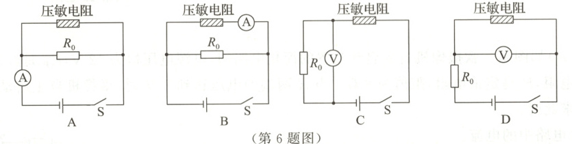 6.压敏电阻的阻值是随所受压力的增大而减小的。小聪想设计一个通过电表示数反映压敏电阻所受压力大小的电路,要求压力增大时电表示数增大。下列电路不符合要求的是 ()