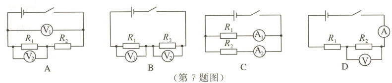7.为了比较电阻$R_{1}$和$R_{2}$的大小,小明分别设计了如下四种电路(电源电压未知),其中可行的是