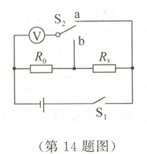 14.在如图所示的电路中,电阻$R_{0}=10$ Ω,闭合开关$S_{1}$,将单刀双掷开关$S_{2}$掷于$a$端,电压表示数为3 V;将$S_{2}$切换到$b$端,电压表示数为1 V。则电源电压为 V,电阻$R_{x}$的阻值为 Ω。