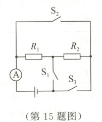 15.如图所示,$R_{1}=6$ Ω,$R_{2}=24$ Ω。当$S_{3}$闭合,$S_{1}$、$S_{2}$断开时,电流表示数为0.2 A,则电源电压为 V;当$S_{1}$、$S_{2}$闭合,$S_{3}$断开时,电流表的示数为 A。