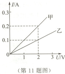 11.如图是甲、乙两导体的电流与电压的关系图像,由图可知,甲的电阻是 Ω。若将甲和乙并联接在电路中,通过它们的电流之比$I_{甲}:I_{乙}=$。