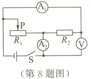 8.如图所示的电路中,电源电压恒定,闭合开关$S$后,滑动变阻器$R_{1}$的滑片$P$向右移动。下列说法错误的是