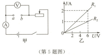 5. 某同学在探究通过电阻的电流与电阻两端电压的关系时,利用如图甲所示电路,在$a$、$b$两点间分别接入定值电阻$R_1$、$R_2$,通过调节滑动变阻器测得了多组数据,并根据数据绘制了两个电阻的$I - U$关系图像,如图乙所示。若将$R_1$、$R_2$组成并联电路,当通过$R_1$的电流为$1\ A$时,通过$R_2$的电流为 ()