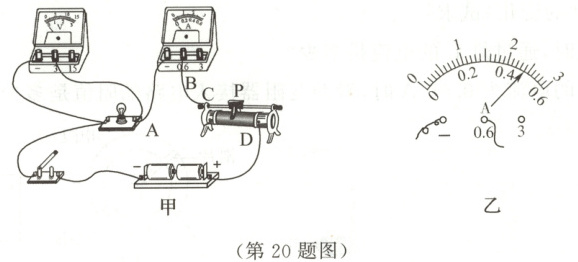 (3)正确连接电路后,闭合开关,调节滑动变阻器的滑片P,当电流表示数为$0.2\ A$时,小明观察到电压表示数如图乙所示,为$ V$,他记下数据并算出电阻$R$的阻值为$\Omega$。