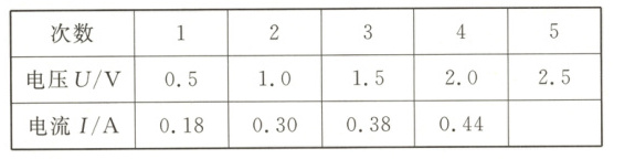 (4)排除故障后,继续进行实验,并将实验数据记录在表格中,第5次实验中电流表的示数如图乙所示,为$ A$。此时小灯泡的电阻约为$\Omega$(结果保留一位小数)。