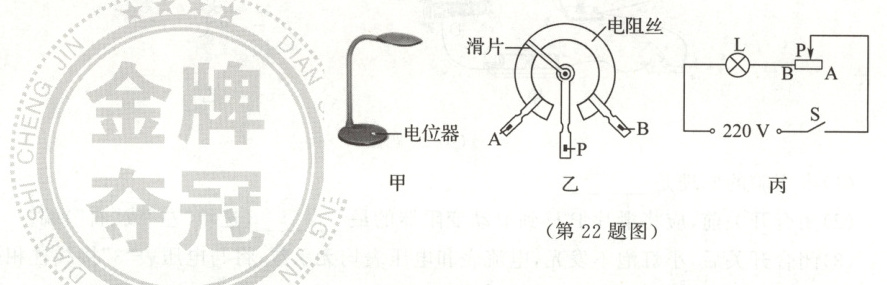 22. (9分)如图甲为一盏可调亮度的台灯,如图乙为其用于调节亮度的电位器的结构图,A、B、P是它的三个接线柱,其中P与金属滑片相连。当顺时针转动电灯旋钮时,滑片会在弧形电阻丝上顺时针移动,即可调节灯泡的亮度。台灯内部的简化电路图如图丙所示,已知电源电压为$220\ V$,灯L的电阻为$2000\ \Omega$,滑动变阻器的阻值范围为$0\sim3500\ \Omega$。(不考虑灯丝电阻随温度的变化)试求:
