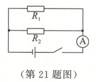 21. (8分)如图所示的电路中,电源电压为$6\ V$,电阻$R_1$的阻值为$20\ \Omega$,闭合开关后,电流表示数为$0.5\ A$。试求: